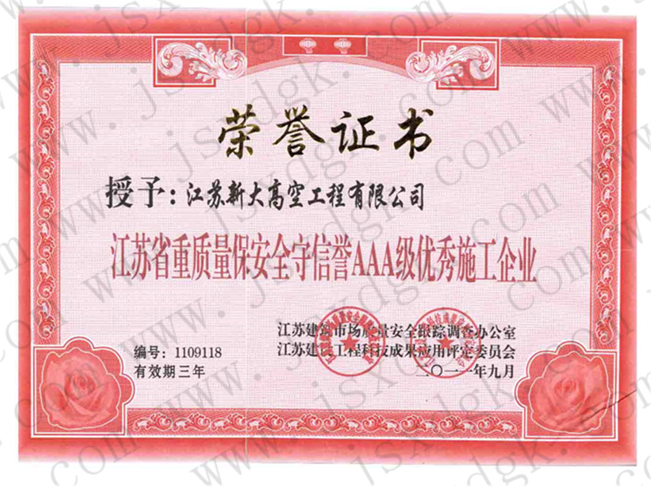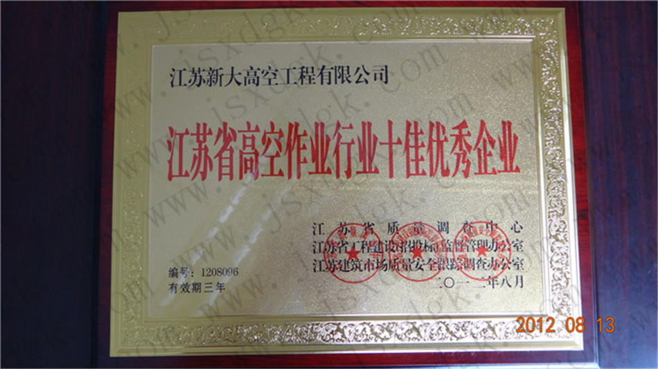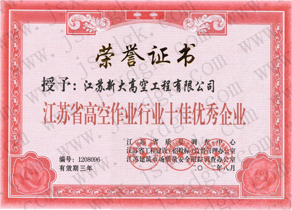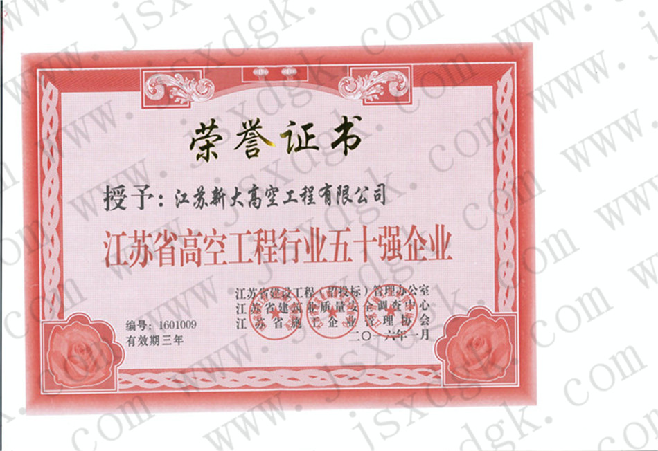 江蘇省高空行業(yè)五十強(qiáng)行業(yè)證書